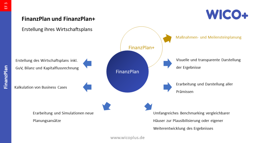 WICO+ ist eine auf das Gesundheitswesen spezialisierte Unternehmensberatung für Krankenhäuser, die Finanzsteuerung und strategische Entscheidungsfindung auf Geschäftsführungs- und Trägerebene integriert.